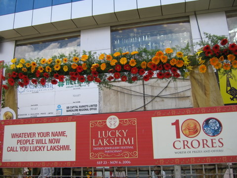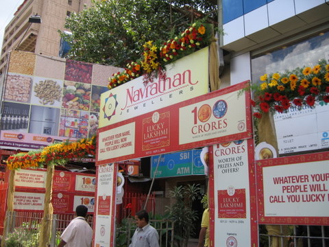 Despite Diwali being the "festival of lights" there are also plenty of flowers around. Marigolds are especially auspicious and appear all over the place. By the way, the Indian currency is the Rupee (about $.02). A lakh is number meaning 100,000. A crore is 100 lakhs or 10 million. So in the context you see here 100 crores really means 100*10,000,000 Rupees. You do see this words applied to other things than money too (like population etc). I'm not sure just what this is advertising. It says "100 Crores of Prizes and Offers", and "Lucky Lakshmi, India's Jewellery Festival Participant". Lakshmi, by the way, is the goddess of wealth, wisdom, and fortune.